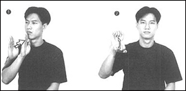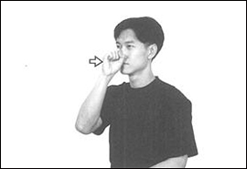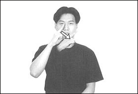 1.오른손을 세우고 검지손가락을 턱 중앙에 두 번 갖다 댄다.