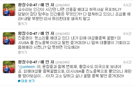 이에 황 소장은 진 교수의 트윗에 “이자 고소당하고 싶나. 꽃뱀 종북 발언 증거대라”고 답글을 달았고, 진 교수가 별다른 반응을 보이지 않자 “진중권이 헛소리를 해대고 있다. 내가 피해 여성을 종북꽃뱀? 미시USA를 친노종북이라고 말한 증거를 대라”고 재차 촉구했다.