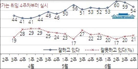 한편, ‘한국갤럽’이 6월 4주(24~27일) 전국 성인 1218명에게 박근혜 대통령이 대통령으로서의 직무를 잘 수행하고 있다고 보는지, 잘못 수행하고 있다고 보는지 질문한 결과, 54%는 긍정 평가했고 21%는 부정 평가했으며 25%는 의견을 유보했다.