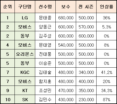 지난 시즌 소속팀 전자랜드를 플레이오프 4강으로 이끈 주태수는 지난 시즌 1억5000만원에서 3억원으로 100% 인상되어 최고 인상률을 기록했고, 뒤를 이어 KGC 최지훈이 4500만원에 계약하며 지난 시즌(2천4백만)대비 87.5%로 보수 인상률 2위에, SK 김민수는 87%가 인상되어 3위에 올랐다.