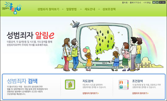 성범죄자알림e 사이트는 여성가족부와 법무부가 운영하는 사이트로 성범죄자의 신상정보를 공개하고 있다. 사용자는 각 지역과 동네별로 성범죄 전과자의 이름과 범죄기록 등을 조회할 수 있다.