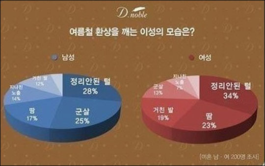 결혼 컨설팅회사 디노블이 20~30대 미혼 남녀 200명에게 ‘여름철 환상을 깨는 이성의 모습이 무엇인지’ 묻자, 남녀 모두 ‘털’을 1위로 꼽았다. 남성들은 ‘정리되지 않은 겨드랑이’(28%)에서 가장 많이 환상이 깨진다고 답했고, 여성들은 ‘다리 털’(34%)을 가장 많이 꼽았다.