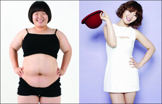 2일 한 방송에서 개그맨 권미진은 자신의 허리사이즈가 40인치에서 25인치로 줄었다고 말했다. 권미진 다이어트 카페 사진(좌), 권미진 트위터 사진(우)