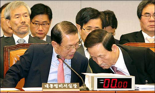김기춘 비서실장과 김장수 안보실장이 14일 오전 국회에서 열린 운영위의 대통령비서실,국가안보실,경호실 국정감사에서 대화를 나누고 있다. ⓒ데일리안 박항구 기자