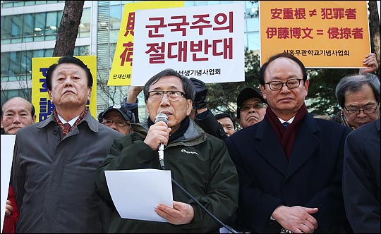 안중근의사기념사업회 회장인 함세웅 신부가 26일 오전 서울 종로구 주한 일본 대사관 앞에서 항일독립운동가단체연합회가 주최해 열린 ‘일본 정부의 안중근 의사 비하 망언 규탄 기자회견’에서 발언하고 있다.