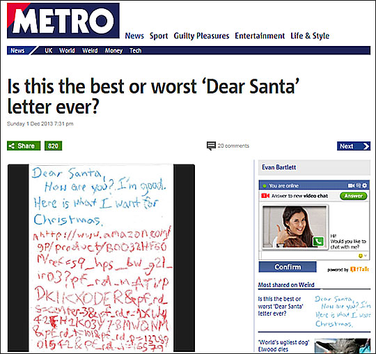1일(현지시각) 영국 일간지 메트로 홈페이지에 아이가 직접 작성한 것으로 보이는‘산타에게 보내는 편지’가 올라왔다. 해당 편지의 내용을 가만히 들여다보면 나도 모르게 저절로 웃음이 새어 나온다.