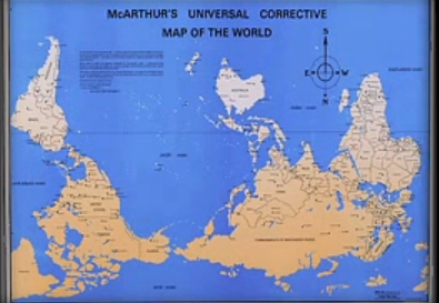 이 지도는 오스트레일리아 출신 맥아더의 세계지도로 일부러 남쪽을 위로 가게끔 하여 제작한 지도다. 이 지도가 뒤집혀 그려진 이유는 이 지도에서 자신의 나라인 오스트레일리아를 지도의 중심에 놓기 위한 수단으로 보인다.