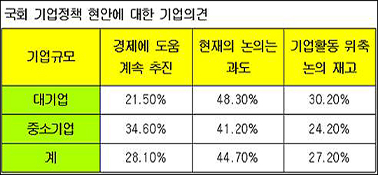 실제 지난 6월 대한상공회의소가 302개 기업을 대상으로 ‘국회 기업정책 현안에 대한 기업의견’을 조사한 결과에 따르면 중소기업의 41.2%는 “경제민주화는 필요한 부분도 있지만 현재의 논의는 과도하다”고 응답했으며, 24.2%는 “경제민주화는 기업 활동을 위축시키므로 논의를 재고해야 한다”고 응답해 전체의 65.4%가 부정적으로 평가했다. 반면 “경제에 도움이 되므로 계속 추진해야 한다”는 중소기업은 34.6%였다.