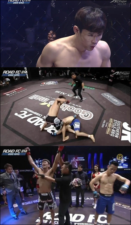 윤형빈은 9일 서울 올림픽공원 내 올림픽홀에서 열린 로드FC 14 메인이벤트 경기에서 타카야 츠쿠다(22·일본)를 상대로 1라운드 실신 KO승을 따냈다.