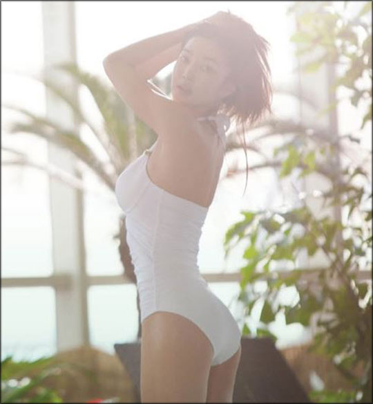 공개된 사진 속 NS윤지는 섹시한 화이트 원피스 수영복을 입고 양 팔을 올린 채 섹시한 포즈를 취하며 서 있다.
