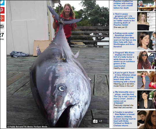 뉴질랜드에서 무려 411.6kg에 달하는 엄청난 크기의 태평양 참다랑어가 낚였다. 데일리메일 홈페이지 화면캡처