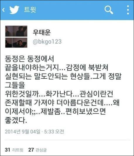 우태운은 4일 자신의 트위터에 “동정은 동정에서 끝을 내야 하는 거지. 감정에 북받쳐 실현되는 말도 안 되는 현상들. 그게 정말 그들을 위한 것일까. 화가 난다. 관심이란 건 존재할 때 가져야 더 아름다운 건데 왜 이제야. 제발 좀 편히 보냈으면 좋겠다”라는 글을 게재했다.