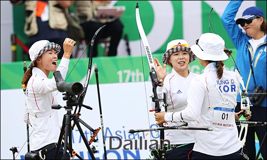 장혜진-정다소미-이특영으로 구성된 여자 양궁 대표팀은 28일 인천 계양아시아드양궁장에서 열린 '2014 인천 아시안게임' 여자 양궁 단체전 결승에서 중국을 3-0(세트스코어 6-0)으로 완파하고 금메달을 따냈다.