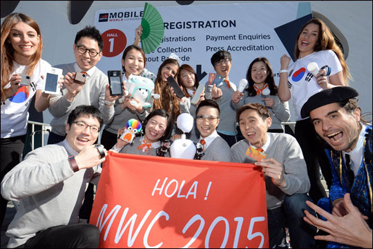 1일 오전(한국시간) ) MWC 전시관 앞에서 SK텔레콤 직원들이 전시 개막을 알리는 퍼포먼스를 하고 있다. ⓒSKT