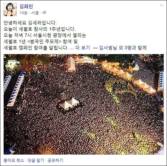 16일 페이스북에 세월호 SNS 캠페인’ 소개, 추모제 참석도 권유