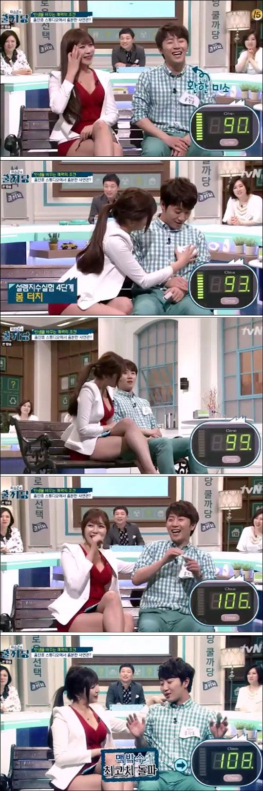 홍진호를 옆에 앉히고 1단계 아이컨택하면서 활짝 웃기를 시작으로, 2단계 긴 생머리를 묶으며 목선 보여주기, 3단계 스치듯 자연스러운 스킨십, 4단계 아주 여성스러운 행동으로 칭찬해주기를 거쳐 5단계 예상치 못한 스킨십으로 어깨 안마해주기 등까지 가자 홍진호의 심장박동수는 순식간에 108을 넘어서 버렸다.