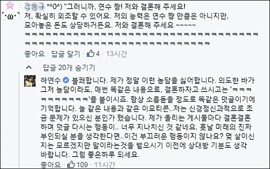 이에 하연수는 직접 댓글을 달며 불쾌한 심경을 드러냈다. 그는 “불쾌합니다. 제가 정말 이런 농담을 싫어합니다. 의도한 바가 그저 농담이라도, 매번 똑같은 내용으로, 결혼하자고 쓰시고는 ‘ㅋㅋㅋㅋㅋㅋㅋㅋㅋㅋ’를 붙이시죠. 항상 소름 돋을 정도로 똑같은 덧글이기에 기억합니다. 늘 같은 내용과 같은 이모티콘”이라고 말문을 열었다.