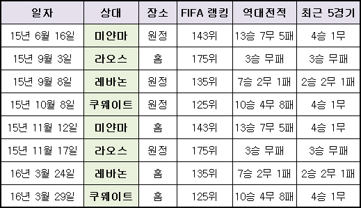 이후 만나게 될 레바논(135위)과 쿠웨이트(125위)는 경계를 늦춰선 안 될 상대들이다. 무엇보다 쿠웨이트는 지난 90년대 대표팀을 지긋지긋하게 괴롭혔던 껄끄러운 상대다. 대표팀은 90년대에만 쿠웨이트에 2승 4패로 밀린 바 있다.