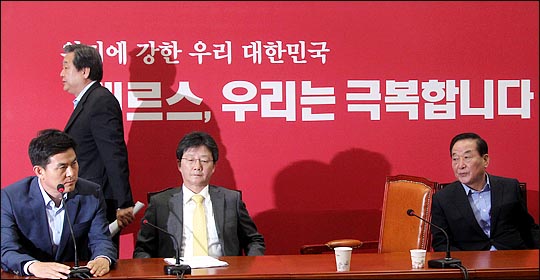 김무성 새누리당 대표가 2일 오전 국회에서 열린 최고위원회의에서 유승민 원내대표의 사퇴를 두고 논란이 거듭되자 '회의 종료'를 선언하고 자리를 떠나고 있다. 김무성 대표는 유승민 원내대표를 옹호하는 원유철 정책위의장이 발언이 끝난뒤 이미 유 원내대표의 사퇴를 촉구하는 발언을 한 김태호 최고위원이 거듭 발언하자 이를 한번 제지한뒤 회의 종료를 선언하고 자리에서 일어나 퇴장했다.