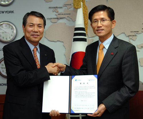 김문수 경기도지사(오른쪽)와 이중재 한국수력원자력(주) 사장이 12일 경기도청에서 팔당댐 상부 공도교의 통행재개에 대한 합의서를 체결후 악수를 하고 있다.
