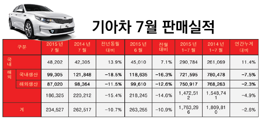 기아차 7월 판매는 신차와 RV 판매 호조로 지난 2000년 현대차그룹 출범 이래 기아차 사상 최다 국내판매를 기록했다. 다만 내수 판매 증가에 따라 수출물량 공급 감소로 해외 판매가 줄었다. 이에 전체 판매는 전년 동월 대비 10.7% 떨어졌다.