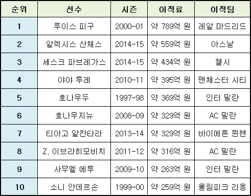 지난 시즌에는 알렉시스 산체스와 파브레가스가 각각 4250만 유로(약 559억원)와 3300만 유로(434억원)의 이적료를 기록했다. 산체스는 아스날의 FA컵 2연패를 이끌었고 파브레가스도 리그 우승의 일등공신이 됐다. 바르셀로나도 지갑이 두둑해져 모두를 만족시킨 이적이 됐다.
