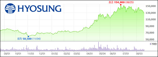 효성의 주가는 지난 6월 25일 15만4000원으로 사상 최고가 기록을 세웠다. 지난해 효성의 주가는 5~7만원대였으나, 올해 초부터 가파른 상승세를 보이며 급등한 것이다. 지난 1년간 최저가였던 5만8500원(2014년 11월 4일 종가)과 비교하면 3배 가까이 오른 셈이다.