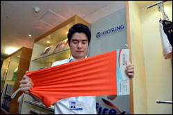 효성 직원이 스판덱스 제품 '크레오라'의 신축성을 시연하고 있다. ⓒ효성