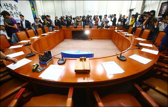 16일 오전 새정치민주연합 국회 당대표회의실에서 최고위원회의가 중앙위원회의 개최로 인해 비공개 회의로 전환된 가운데 참석자들의 자리가 비어 있다. ⓒ데일리안 홍효식 기자