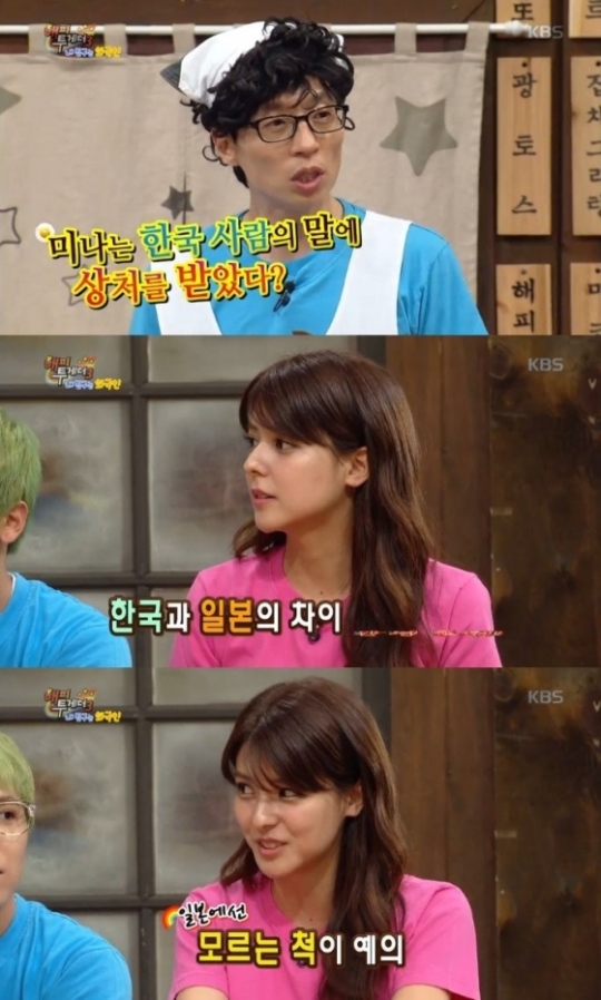 이날 방송에서 MC 유재석은 "미나 씨는 (한국의) 너무 솔직한 말 때문에 상처를 받을 때가 있었다고"라 질문했다.