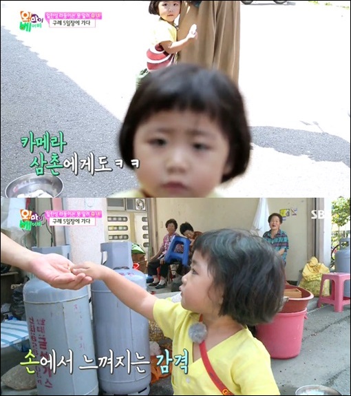 이날 라둥이는 구례 5일장의 뻥튀기 가게에서 갓 튀겨낸 뻥튀기를 선물 받았다. "할머니도 드려라"라는 엄마 슈의 말에 라율은 할머니에게 다가가 뻥튀기를 건넸다.