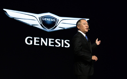 정의선 현대자동차 부회장이 4일 서울 동대문플라자에서 열린 '제네시스' 브랜드 런칭 미디어 설명회에서 브랜드 런칭 배경에 대해 설명하고 있다.ⓒ현대자동차