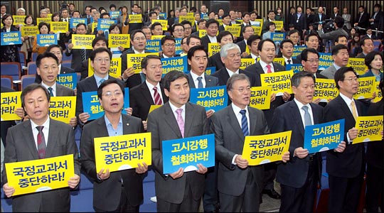 문재인 새정치민주연합 대표와 이종걸 원내대표를 비롯한 의원들과 시도당 및 지역위원장들이 5일 국회에서 열린 역사교과서 국정화 저지를 위한 시도당 및 지역위원장 연석회의에서 국정교과서 중단을 요구하는 구호를 외치고 있다.