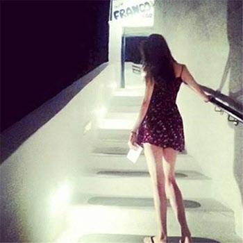 사진 속 조혜정은 날씬한 몸매가 드러나는 미니 원피스 입고 계단을 오르고 있다.