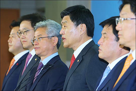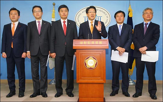 8일 오전 국회 정론관에서 국회 각 상임위 여당 간사들이 공동 기자회견을 열고 야당에게 정기국회내 노동개혁법 등 주요 법안의 조속한 처리를 촉구하는 기자회견을 하고 있다. 왼쪽부터 새누리당 김용남 원내대변인, 기획재정위원회 강석훈 간사, 정보위원회 이철우 간사, 외교통일위원회 심윤조 간사, 산업통상자원위원회 이진복 간사, 환경노동위원회 권성동 간사. ⓒ데일리안 홍효식 기자