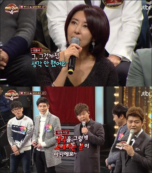 변진섭은 19일 방송된 JTBC ‘히든싱어4’에 출연, 패널로 참가한 ‘원조 디바’ 김완선에게 면박을 줬다.
