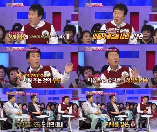 송대관은 "외유내강형의 아내는 나에게 정신적 지주와도 같다. 오늘 출연을 위해 아내가 반짝이 의상도 특별히 준비해줬다. 남편의 사업이 실패했다고 이혼을 요구하는 아내가 없듯, 아내의 사업이 실패했다고 이혼하자는 남편도 없다. 배우자의 부족한 점을 채워 주는 것이 부부라고 생각한다"고 남편에 대한 믿음을 드러냈다.