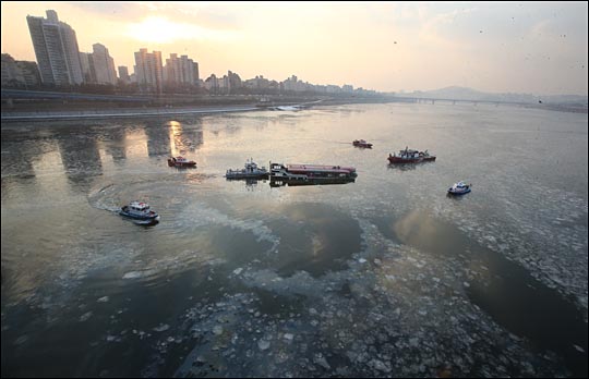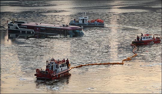 26일 오후 서울 영동대교 인근 한강에서 유람선이 침수되어 구조대가 기름 유출 제거 작업을 하고 있다. 유람선에 타고있던 승객과 승무원 등 총 11명은 전원 구조됐다. ⓒ데일리안 홍효식 기자