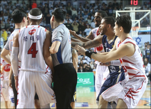 양 팀은 챔프전 내내 곳곳에서 기싸움과 충돌을 벌였다. 아슬아슬한 장면도 몇 차례 나왔다. 1차전에서는 양 팀의 슈터인 문태종과 김민구가 몸싸움을 벌였다. 팔이 엉킨 상황에서 문태종이 김민구를 뿌리치자 이에 지지 않고 김민구가 문태종에게 달려드는 듯한 제스처를 취하기도 했다. 이 과정에서 김민구가 욕설을 하는 모습이 포착되며 뜨거운 논란을 일으켰다.