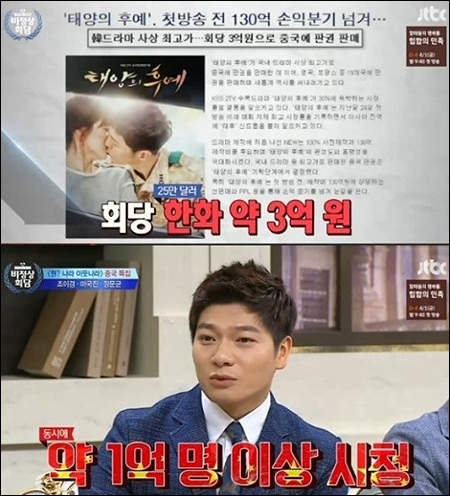 이날 장위안은 "약 1억 명 이상의 중국인들이 '태양의 후예'를 시청하고 있다"면서 "드라마 '태양의 후예' 한 편당 판권이 약 3억원 정도"라고 밝혀 놀라움을 자아냈다.