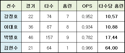 한국 선수들 중에서도 단연 앞서나가는 강정호다. 전날 8호 홈런을 터뜨렸던 시애틀 이대호는 강정호보다 조금 높은 10.88타수당 홈런을 뽑아내고 있다. 이대호 역시 리그 톱클래스 수준의 홈런 페이스이지만, 강정호와의 비교에서는 한 수 접어야 한다.