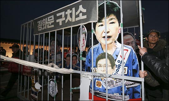 박근혜 탄핵인용 다음날인 11일 오후 서울 광화문광장에서 열린 박근혜 정권 퇴진행동 주최 20차 촛불집회에서 광화문 구치소에 수감된 박근혜 퍼모먼스를 보여주고 있다.