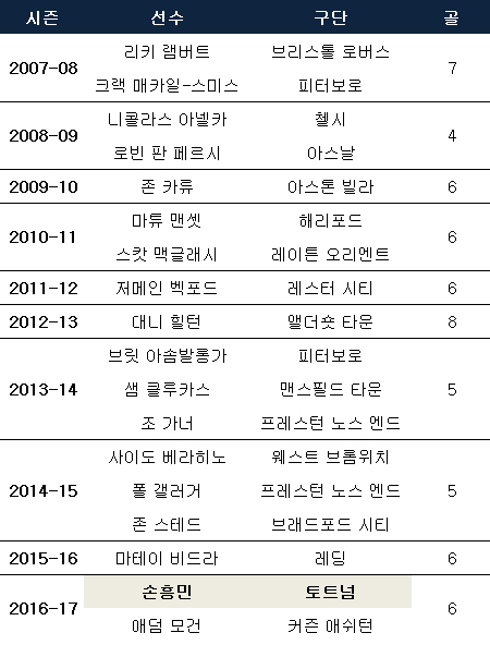 여기에 스쿼드 로테이션을 쓰고 있는 팀들도 상당해 최근 들어 득점왕들은 10골을 넘기기가 힘든 게 현실이다. 실제로 지난 10년간 10골을 넘긴 선수는 전무했으며 지난 시즌까지 3년 연속 6골 이하에서 득점왕이 나오고 있다. 손흥민은 이미 6골을 넣은 선수다.