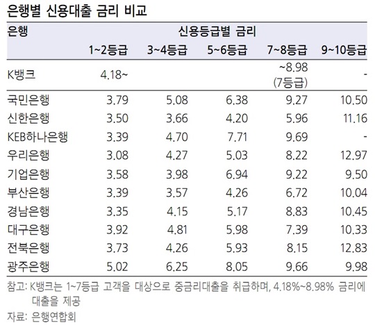 실제로 케이뱅크의 1년 만기 정기예금의 금리는 1.80%로 전북은행(1.80%)과 동일하다. 신용대출의 경우에는 4.18%~8.98%(외부 신용평가사(CB) 1~7등급 대상)인데 우리은행의 1~8등급 구간의 3.08%~8.22%로 상품 대비 크게 차이가 나지 않는다.