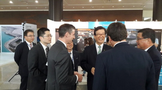 제임스 카메론(왼쪽에서 세 번째) HSBC 아시아태평양 인프라투자담당 이사, 이동걸(왼쪽에서 네 번째) KDB산업은행 회장 등이 지난 16일 제주 국제컨벤션센터에서 열린 제 2차 아시아인프라투자은행(AIIB) 연차총회에 참여해 얘기를 나누고 있다.ⓒKDB산업은행