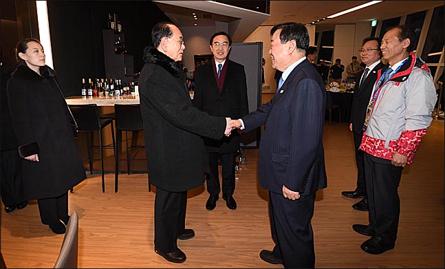 조명균 통일부 장관과 이희범 평창올림픽 조직위원장, 최문순 강원도지사 일행이 북한 김영남 최고인민회의 상임위원장과 김정은 북한 노동당 위원장의 동생 김여정 노동당 중앙위 제1부부장 일행이 10일 강원 강릉시 스카이베이 경포호텔에서 열린 통일부 장관 주재로 마련된 만찬에서 인사를 나누고 있다. ⓒ사진공동취재단