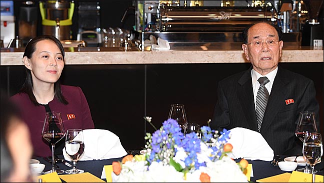 북한 김영남 최고인민회의 상임위원장과 김정은 북한 노동당 위원장의 동생 김여정 노동당 중앙위 제1부부장 일행이 10일 강원 강릉시 스카이베이 경포호텔에서 마련된 '통일부 장관 주재 남북고위급만찬장'에 참석하고 있다. ⓒ사진공동취재단