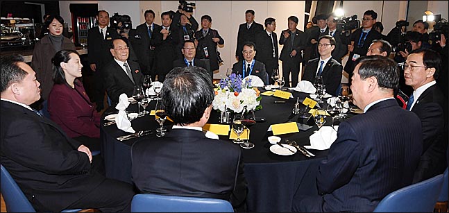 북측 대표단은 이날 오후 6시 23분께 호텔 내부 식당에 모습을 드러냈다. 모두 가슴에 김일성 김정일 휘장(배지)을 단 모습이었다. 김영남 단장이 선두에 서고 이어 조명균 장관, 김여정 등이 차례로 엘리베이터에서 내려 식당에 들어섰다.