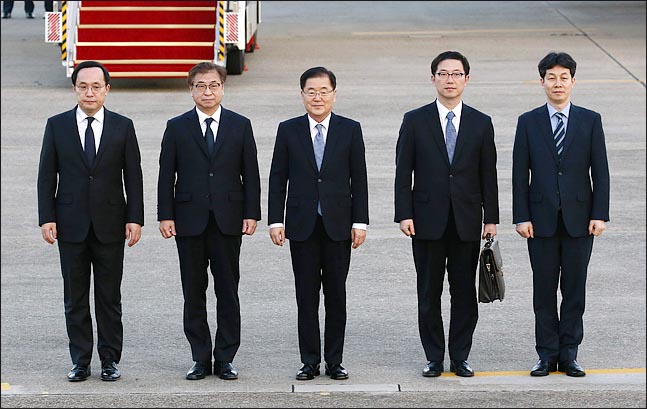 정의용 청와대 국가안보실장을 수석특사로 한 대북특사단이 1박2일의 대북 일정을 마친 후 6일 오후 경기 성남시 서울공항에서 도착해 귀국 인사를 준비하고 있다. 왼쪽부터 김상균 국정원 2차장, 서훈 국정원장, 정의용 청와대 국가안보실장, 천해성 통일부 차관, 윤건영 청와대 국정상황실장.