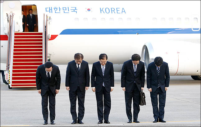 정의용 수석 대북특사(청와대 국가안보실장)와 서훈 국정원장 등 대북특사단이 6일 오후, 1박 2일 방북 일정을 마치고 서해직항로를 통해 서울공항에 도착해 대통령 전용기인 공군 2호기에서 내려 귀국 인사를 하고 있다. 왼쪽부터 김상균 국정원 2차장, 서훈 국가정보원장, 정 수석 대북특사, 윤건영 청와대 국정상황실장, 천해성 통일부 차관.